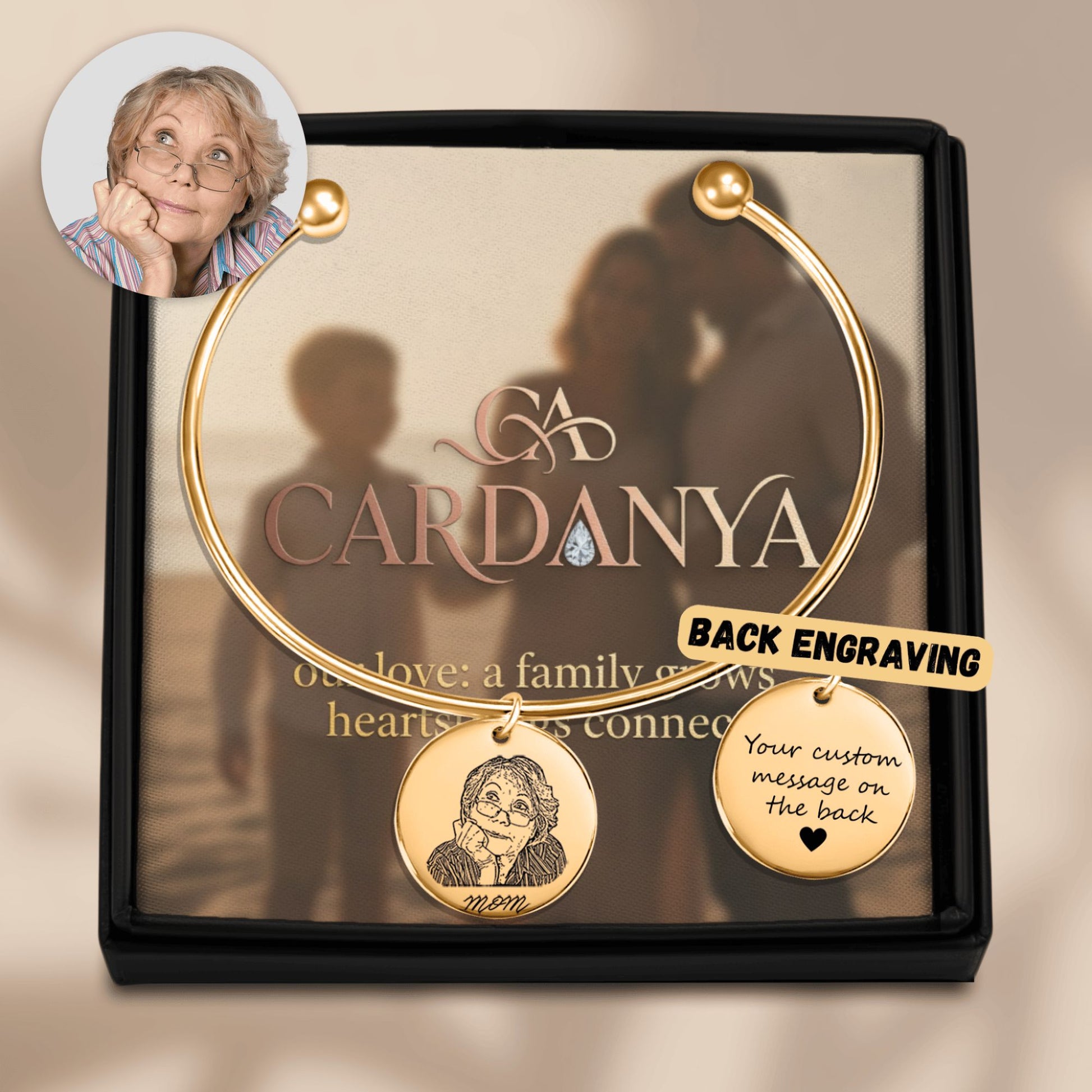 The Hand-Drawn Portrait Bangle from our Timeless Mom collection is more than jewelry—it's a story told through art. Our dedicated designers transform your most cherished photograph into a minimalist line-art engraving, creating a unique piece that she can carry with her everywhere.